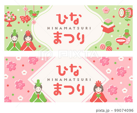 ひな祭り・ひな人形のイラストとフレームセット。ひなまつり、桃の節句、3月のイベント、日本の伝統行事。