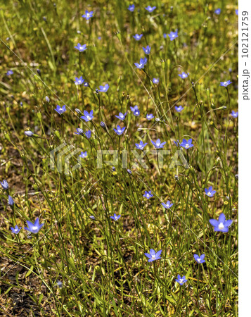 日当たりの良い地面にたくさん咲いているヒナギキョウの花