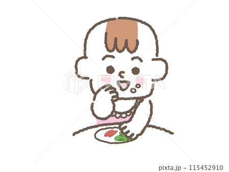 食べ物を掴んで食べている赤ちゃんのイラスト