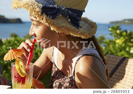 沖縄カップル旅行 絶景のテラス カクテルを飲む女性