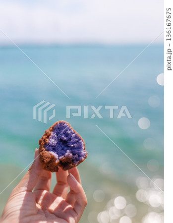 海を背景に持つべにいもぱんびん(サーターアンダギー)