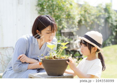 苺の花と実、収穫、家庭菜園、畑、野菜、果物イメージ素材