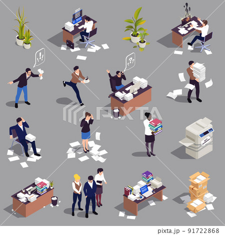Chaotic office characters. Paper piles and folders stacks. Tired managers and businessmen. People work with documents, recent vector scenes