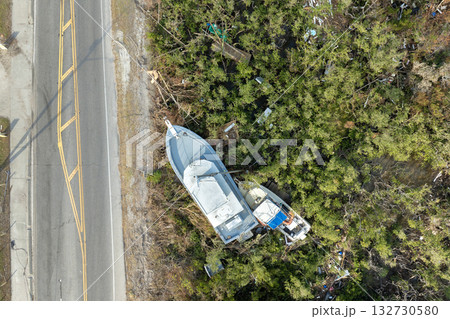 Aerial view of destroyed sailboat after hurricane Milton in Englewood, Florida
