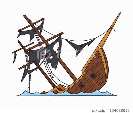 Cartoon pirate ship sinking in the ocean with torn black sails and broken mast. Wooden sunken vessel with skull flag and waves. Groovy vector shipwreck corsair adventure, sea danger and pirate history