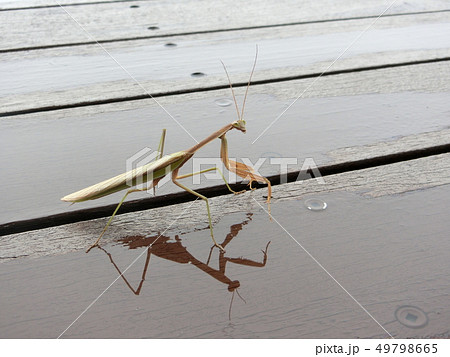 カマキリ、横向き、目が合う、雨上がり、夏、ウッドデッキ