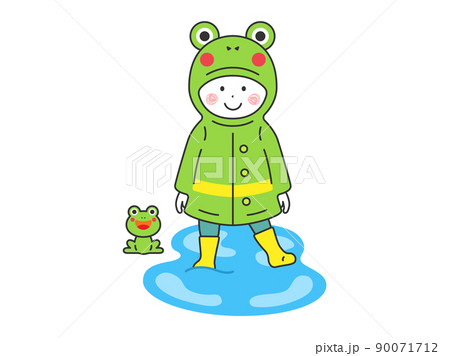 カエルのレインコートを着て、水溜りに入る男の子のイラスト