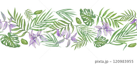 Flying tropical leaf branches watercolor horizontal seamless banner. Purple striped tradescantia, green palm, and monstera leaves pattern. Summertime illustration for textile, kitchen canvas