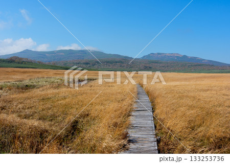 草紅葉に染まる雨竜沼湿原と木道の秋景色(北海道)