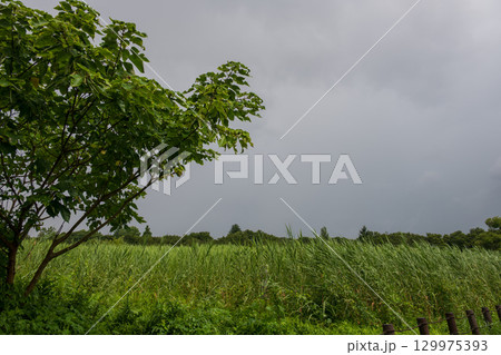 ハスまつりが始まった季節 雨の合間の城沼のほとりの風景