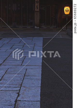和風舞台と提灯のある雪景色背景 冬の室内イメージ