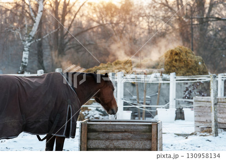 Scenic view one horse in cover rugs eat on snow winter cold paddock on farmyard against steaming manure straw pile on warm sunset evening. Scene countryside rural landscape with livestock animals