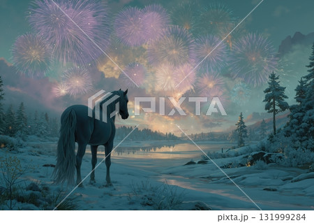 Lone horse in snowy landscape witnessing fireworks under starry night sky on New Year 2026, background