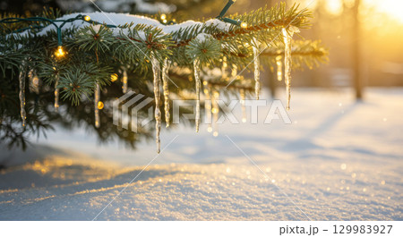 Snow-covered fir branch with icicles and golden lights in a magical winter forest at sunset.