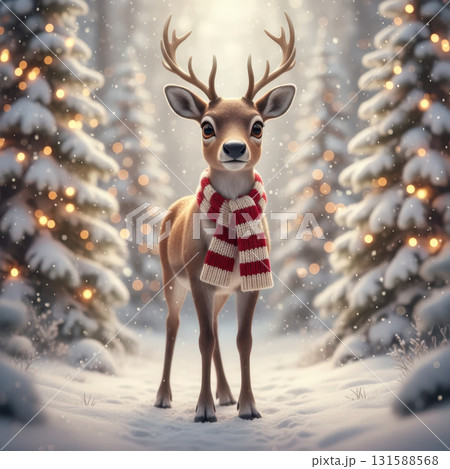 Reindeer wearing red striped scarf standing in snowy winter forest scene