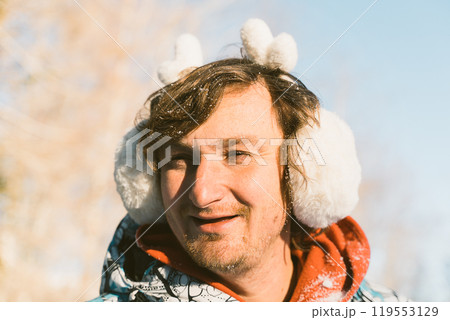 Man in warm earmuffs with snowflakes on his hair on a sunny winter day
