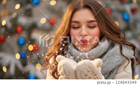 Christmas young woman blowing snowflakes from hands in knitted mittens, decorated tree and festive lights in blurred winter background