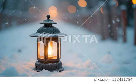 Illuminating the winter night, a solitary lantern casts a warm glow across the snow-covered
