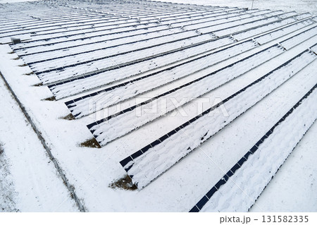 Aerial view of sustainable electrical power plant with solar photovoltaic panels covered with snow in winter for producing clean energy. Concept of low effectivity of renewable electricity in north