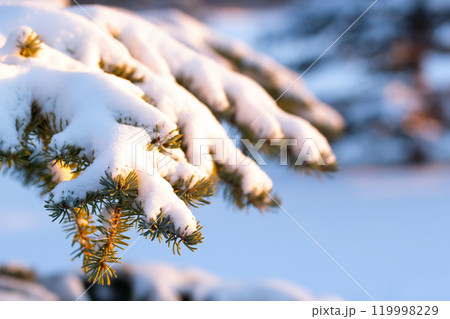 Fir branch covered with snow in sunset warm light.