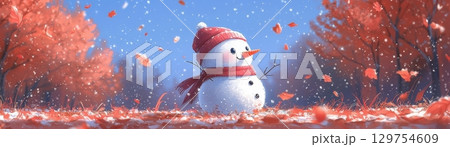 Cheerful Snowman Surrounded by Colorful Autumn Leaves in a Winter Wonderland Scene