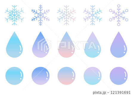 グラデーションがかった雪の結晶と雫のアイコンイラストセット 雪解け