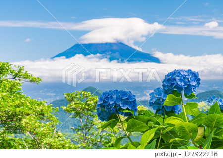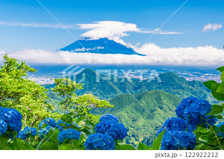 (静岡県)伊豆の国パノラマパーク 山頂のアジサイと富士山の展望
