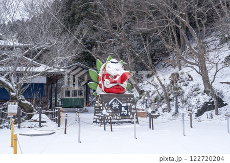 雪が積もった叡山電鉄鞍馬駅 鞍馬天狗 大天狗
