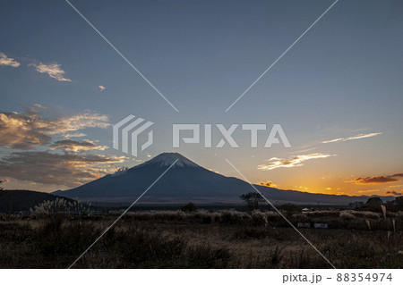 夕暮れに沈みゆく雪をかぶった秋の富士山・忍野村