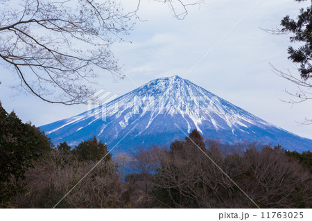 冬枯れた木々の情景を醸し出す雪化粧の富士山1
