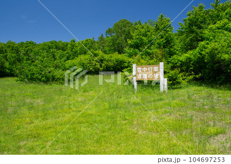 新緑の青森県八甲田、1902年の雪中行軍遭難事件での馬立場にある遭難現場の看板