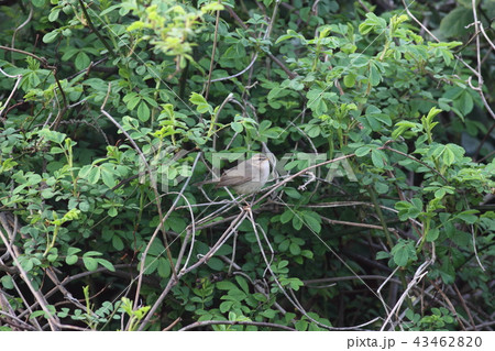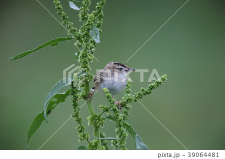 夏、アレチハナガサに留まって鳴く小鳥のセッカ