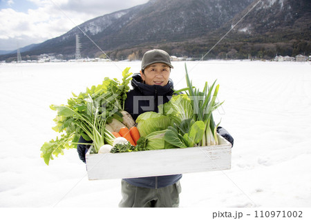 越冬野菜を持つ日本人女性、雪下野菜、農業