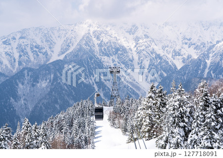 厳冬期の新穂高ロープウェイ 笠ヶ岳の雪渓を背して登るキャビン 岐阜県高山市