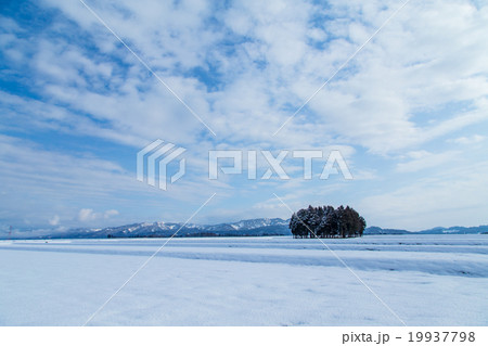 新潟県小千谷市 魚沼産コシヒカリの雪田と青空