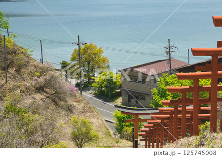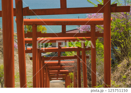 獅子崎稲荷神社のコバノミツバツツジの群落と赤鳥居/天橋立、雪舟観展望所