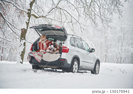 Drinking from the cup. Woman with her daughter is on the trunk of a car in the winter meadow and forest
