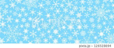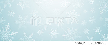 Christmas illustration with various snowflakes on light blue.