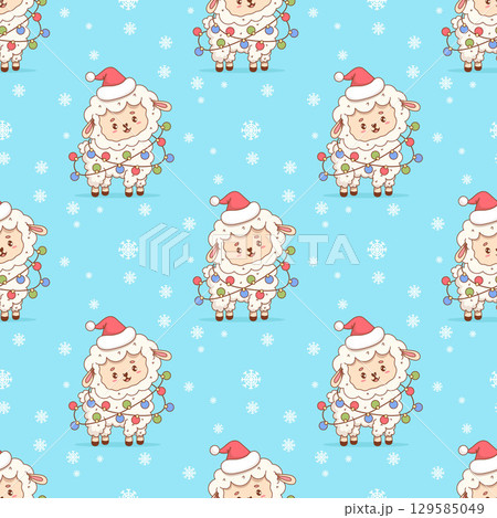 Seamless pattern Cute Christmas Sheep in Santa Hat with Festive Garland Balloons on blue background. Adorable New Year Farm kawaii Animal character. Vector illustration. Kids collection Not AI
