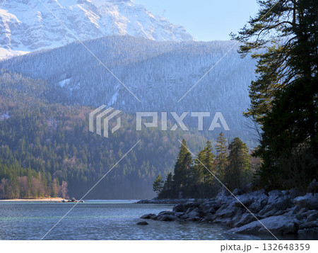 Winter landscape with mountains and a serene lake surrounded by evergreen trees in the early morning light