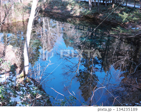 (山梨県)忍野の新名庄川沿いから望む富士山・雪景色