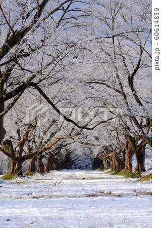 霧氷で桜が満開のような冬の桜並木