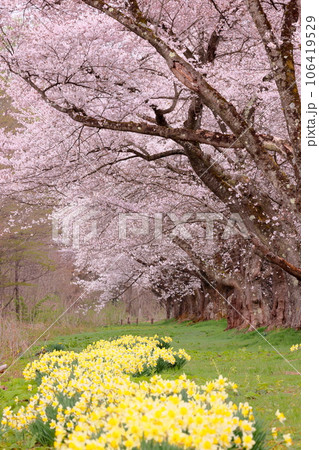 岩手県岩手郡雫石町根堀 さくらの名所雫石川園地のソメイヨシノ桜並木のトンネルとラッパスイセン