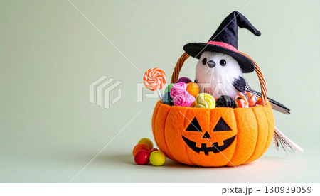 ハロウィンかぼちゃバスケットに入ったシマエナガのぬいぐるみとキャンディ飾り