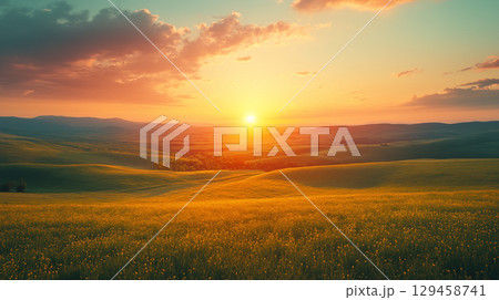 Rolling hills covered with golden wildflowers under dramatic sunset sky creating serene natural landscape. Concept of wilderness and tranquility