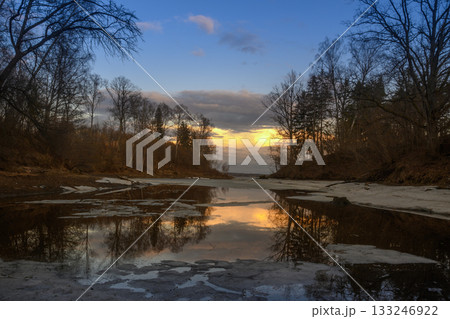 Serene Winter Landscape with Stunning Sunset Over Frozen Snowy Terrain and Cloudy Sky