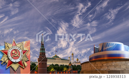 Moscow Kremlin (with decorations for the holiday of May 9 in honor of Victory Day celebration (WWII). Against the sky with clouds, Russia. TRANSLATION: Victory!, Patriotic war