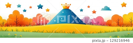 Colorful Cartoon Landscape with Hill, Crown, Stars, Clouds, and Trees in Bright Autumn Colors