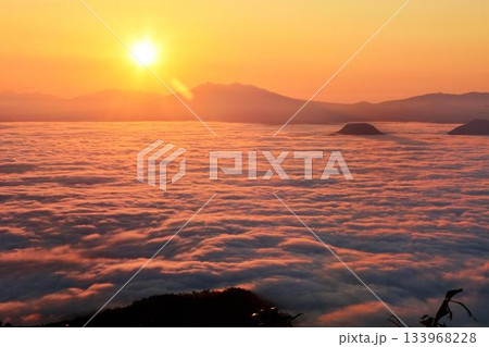 朝日が染める雲海と山のシルエット 黄金色の光が広がる幻想的な風景