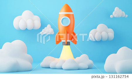 Orange rocket launching among fluffy clouds in blue sky